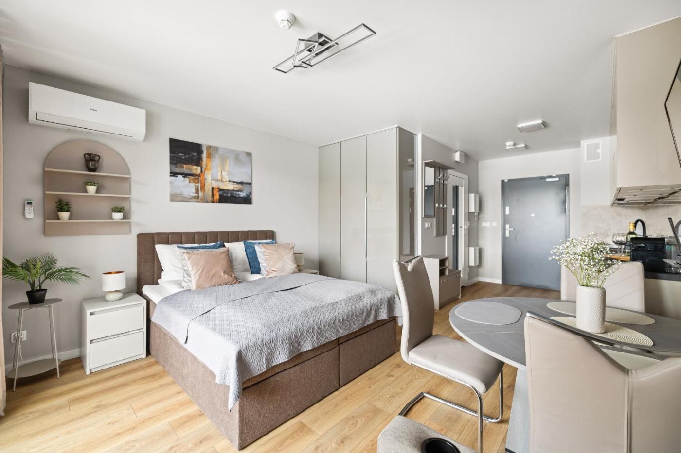 Studio z łóżkiem typu king-size i rozkładaną sofą. The studio has a private bathroom, a washing machine, a tea and coffee maker, as well as a seating area with a flat-screen TV. The well-fitted kitchenette features a stovetop, a refrigerator, a dishwasher and kitchenware. Boasting a balcony, this studio also offers a dining area, a wardrobe and a TV. The unit has 2 beds. Studio - 4 osobowy. Powierzchnia pokoju ok.: 30 mkw. ;