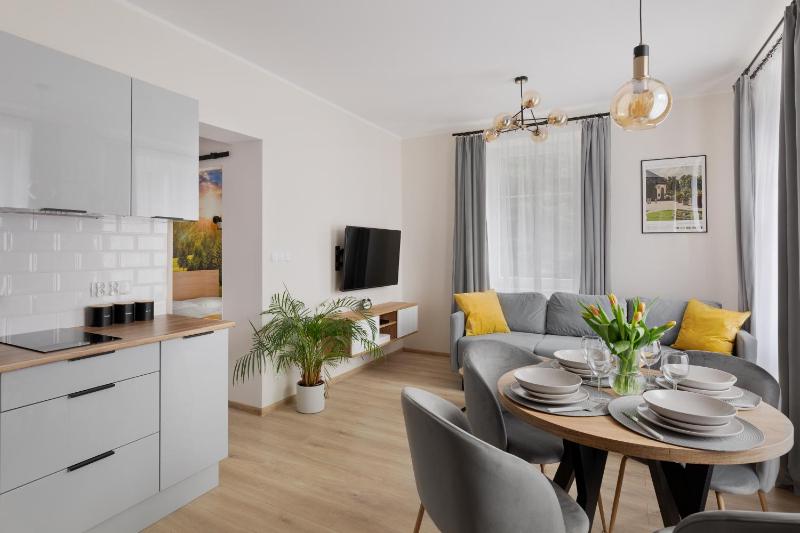 Apartament z 1 sypialnią. This apartment is comprised of 1 living room, 1 separate bedroom and 1 bathroom with a shower and a hairdryer. Meals can be prepared in the well-fitted kitchen, which is fitted with a stovetop, a refrigerator, kitchenware and a tea and coffee maker. The apartment offers a flat-screen TV, a seating area, a wardrobe, a sofa as well as city views. The unit offers 2 beds. Apartament - 4 osobowy. Powierzchnia pokoju ok.: 32 mkw.
