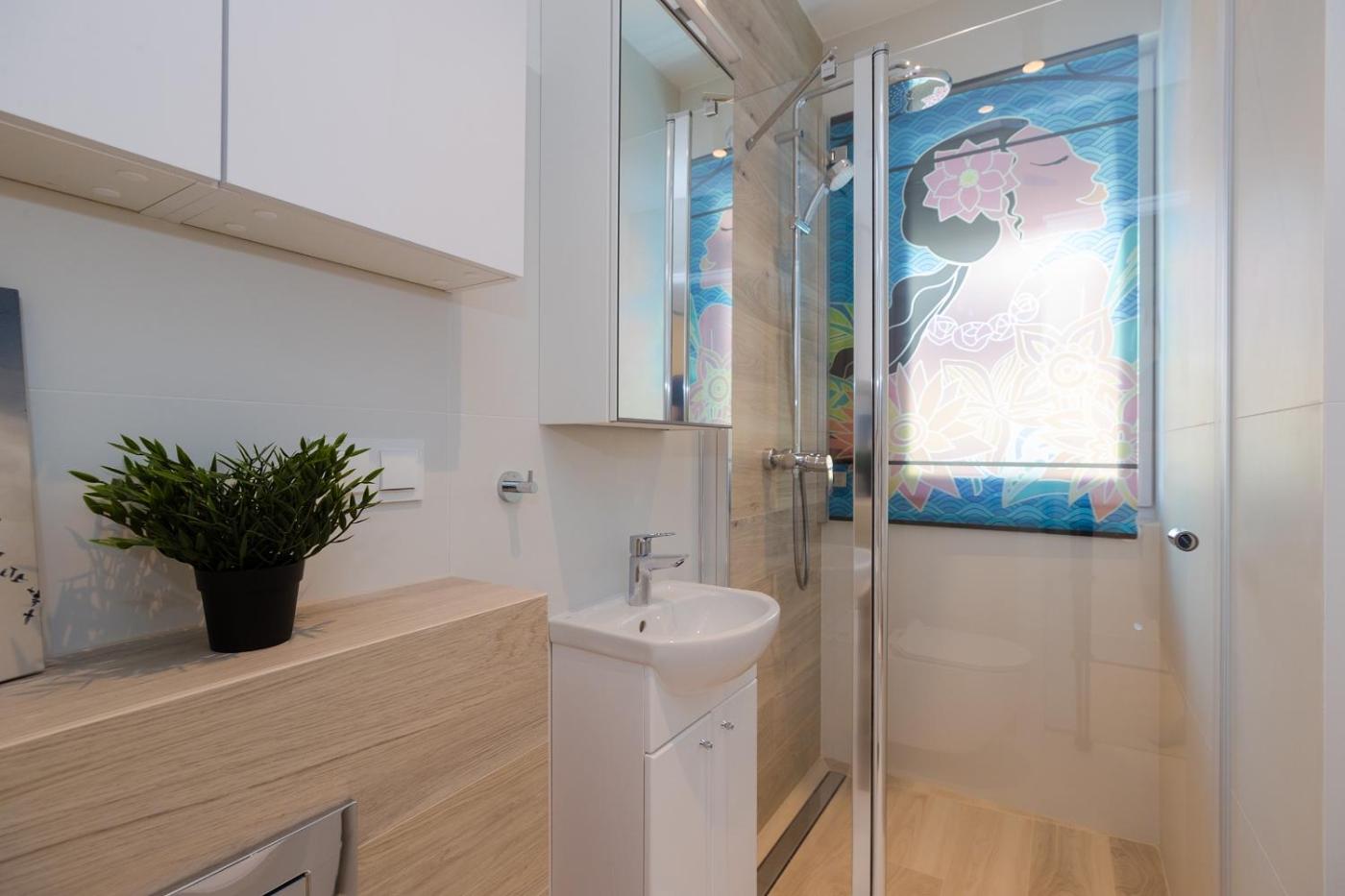 Studio z rozkładaną sofą. The studio features a private bathroom, a washing machine, a tea and coffee maker, as well as a seating area with a flat-screen TV. The fully equipped kitchen has a stovetop, a refrigerator, a dishwasher and kitchenware. Among the room amenities are a dining area, a wardrobe and a sofa as well as garden views. The unit offers 1 bed. Studio - 2 osobowy. Powierzchnia pokoju ok.: 21 mkw. ;