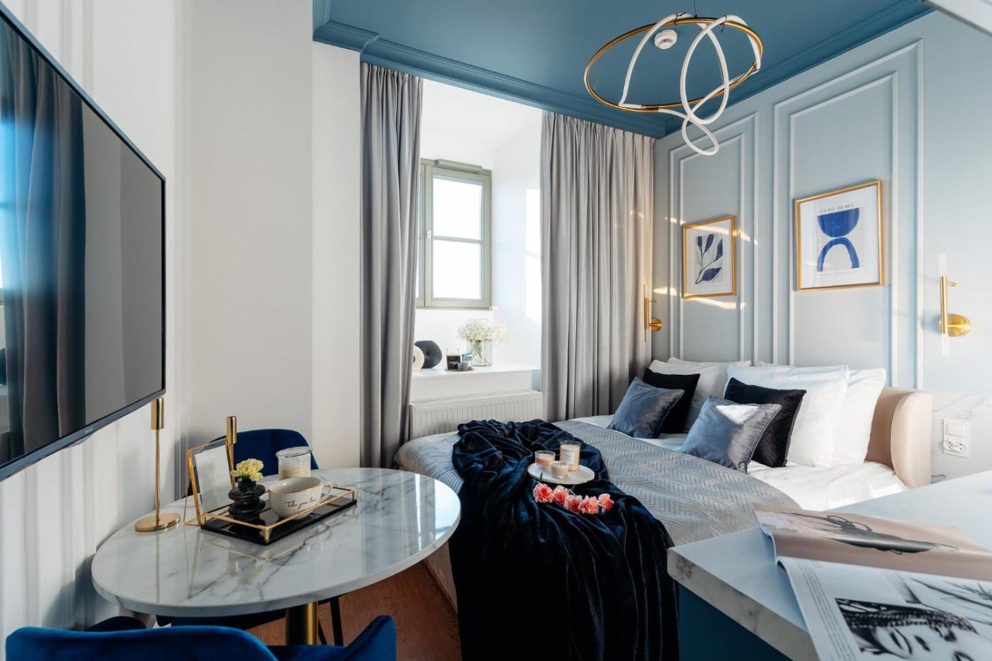 Studio typu Superior z łóżkiem typu king-size i widokiem na Starówkę. W tym studiu znajduje się prywatna łazienka z prysznicem typu walk-in, suszarką do włosów i bezpłatnymi przyborami toaletowymi. Udogodnienia obejmują w pełni wyposażony aneks kuchenny z płytą kuchenną, lodówką, zmywarką do naczyń i przyborami kuchennymi. Udogodnienia w studiu obejmują klimatyzację, oddzielne wejście, pralkę, telewizor z płaskim ekranem i dostępem do serwisów streamingowych oraz zestaw do parzenia kawy i herbaty. Z okien roztacza się widok na miasto. W tej opcji zakwaterowania jest dostępne 1 łóżko. Studio - 2 osobowy. Powierzchnia pokoju ok.: 19 mkw. ;