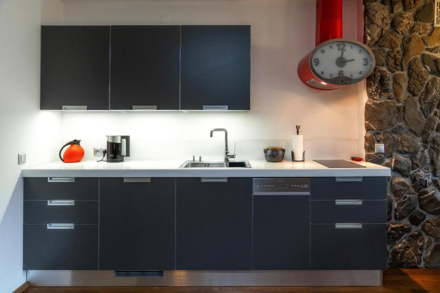 Apartment with Sauna (Level -1). The sauna is the standout feature of this apartment. Boasting a private entrance, this apartment includes 1 living room, 1 separate bedroom and 1 bathroom with a bath or a shower and a hairdryer. Guests can make meals in the kitchen that is fitted with a stovetop, a refrigerator, kitchenware and a microwave. The apartment offers a washing machine, a seating area, a dining area, a flat-screen TV with cable channels, as well as ancourtyard view. The unit has 3 beds. Apartament - 5 osobowy. Powierzchnia pokoju ok.: 53 mkw. ;